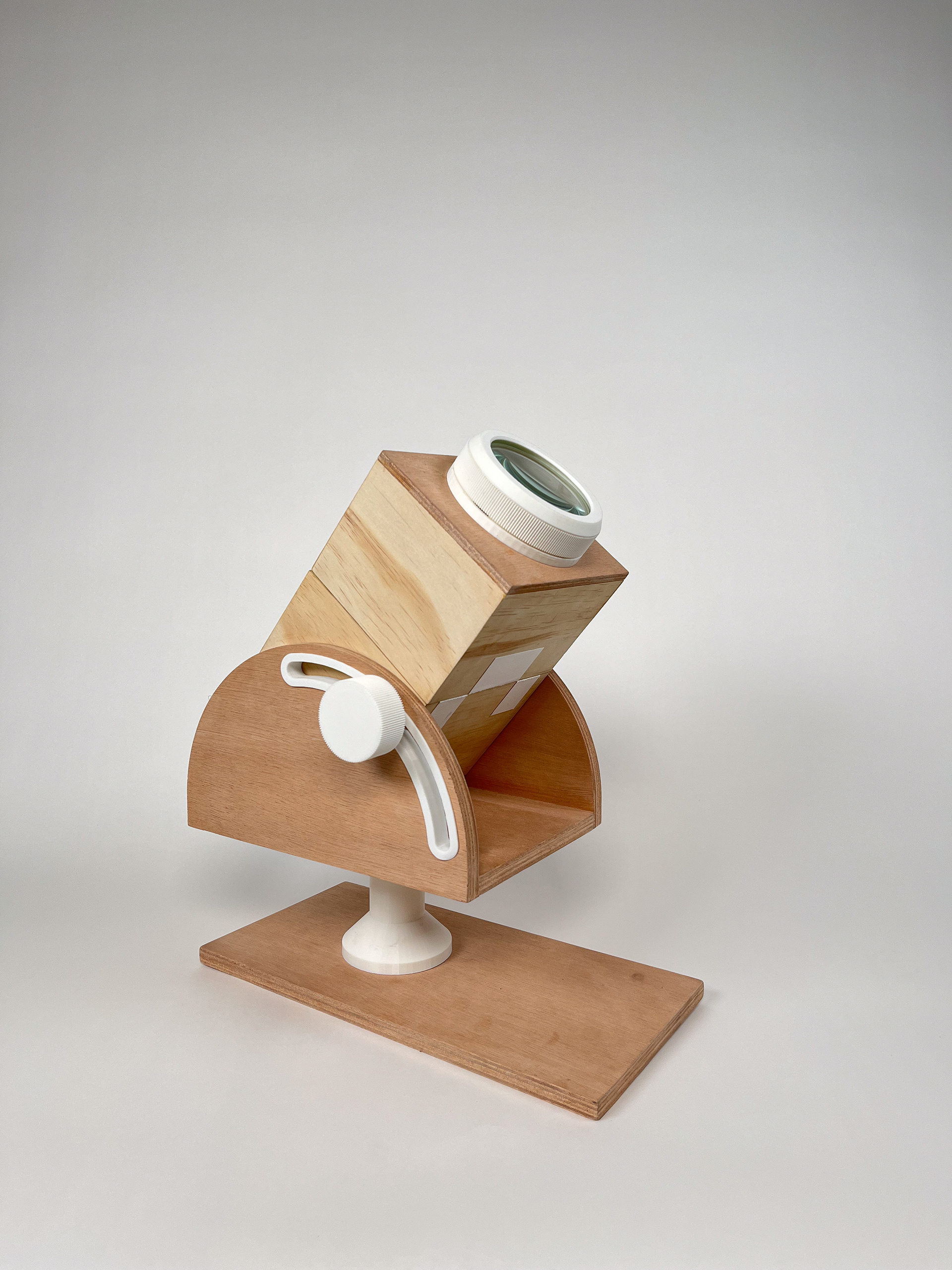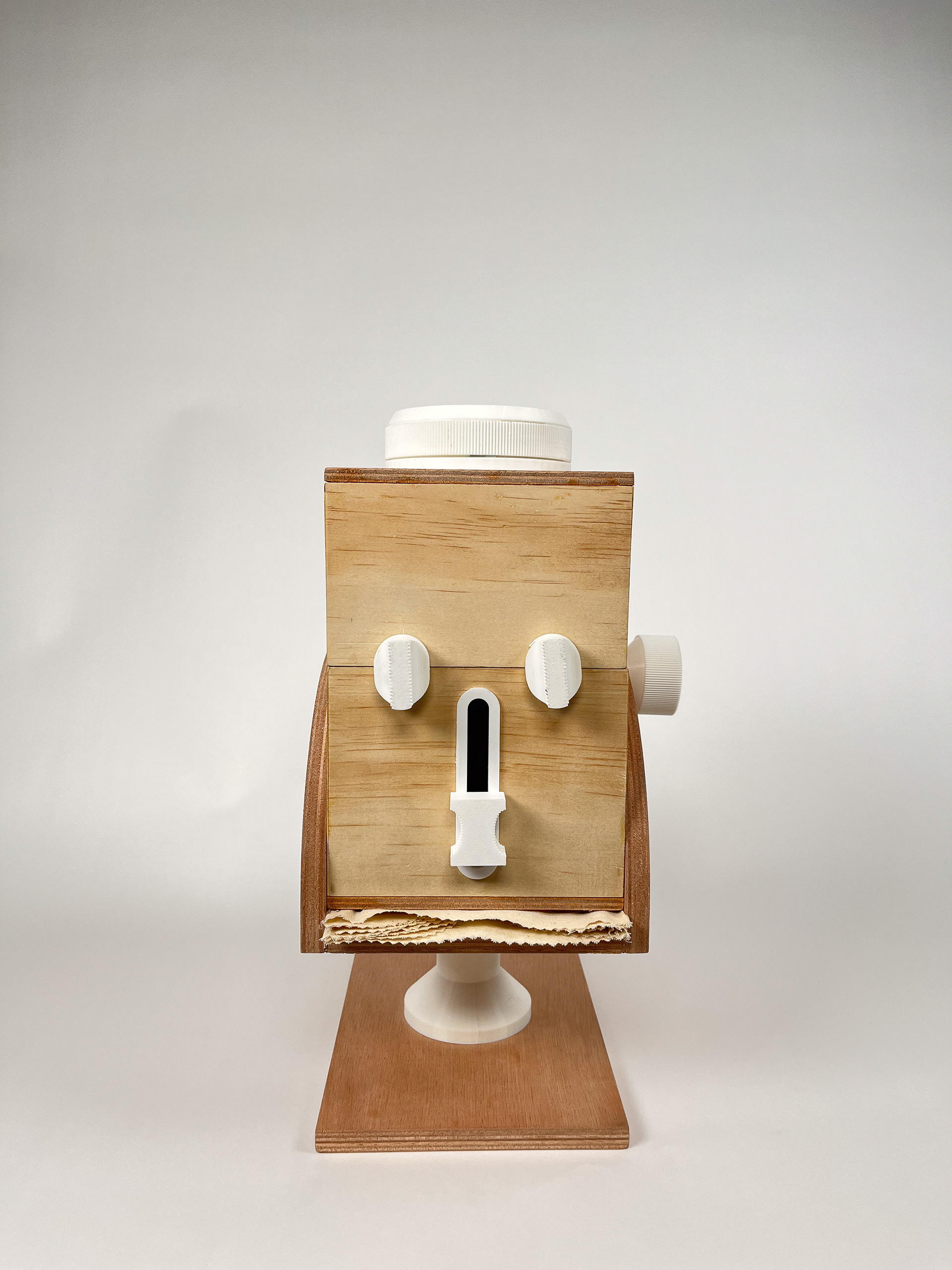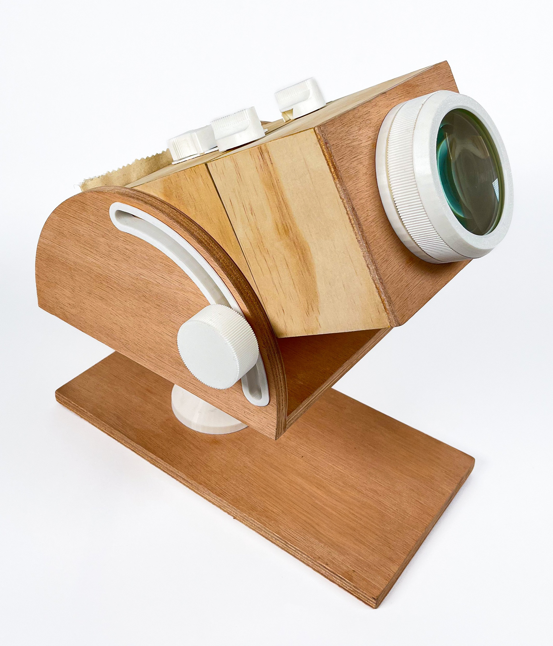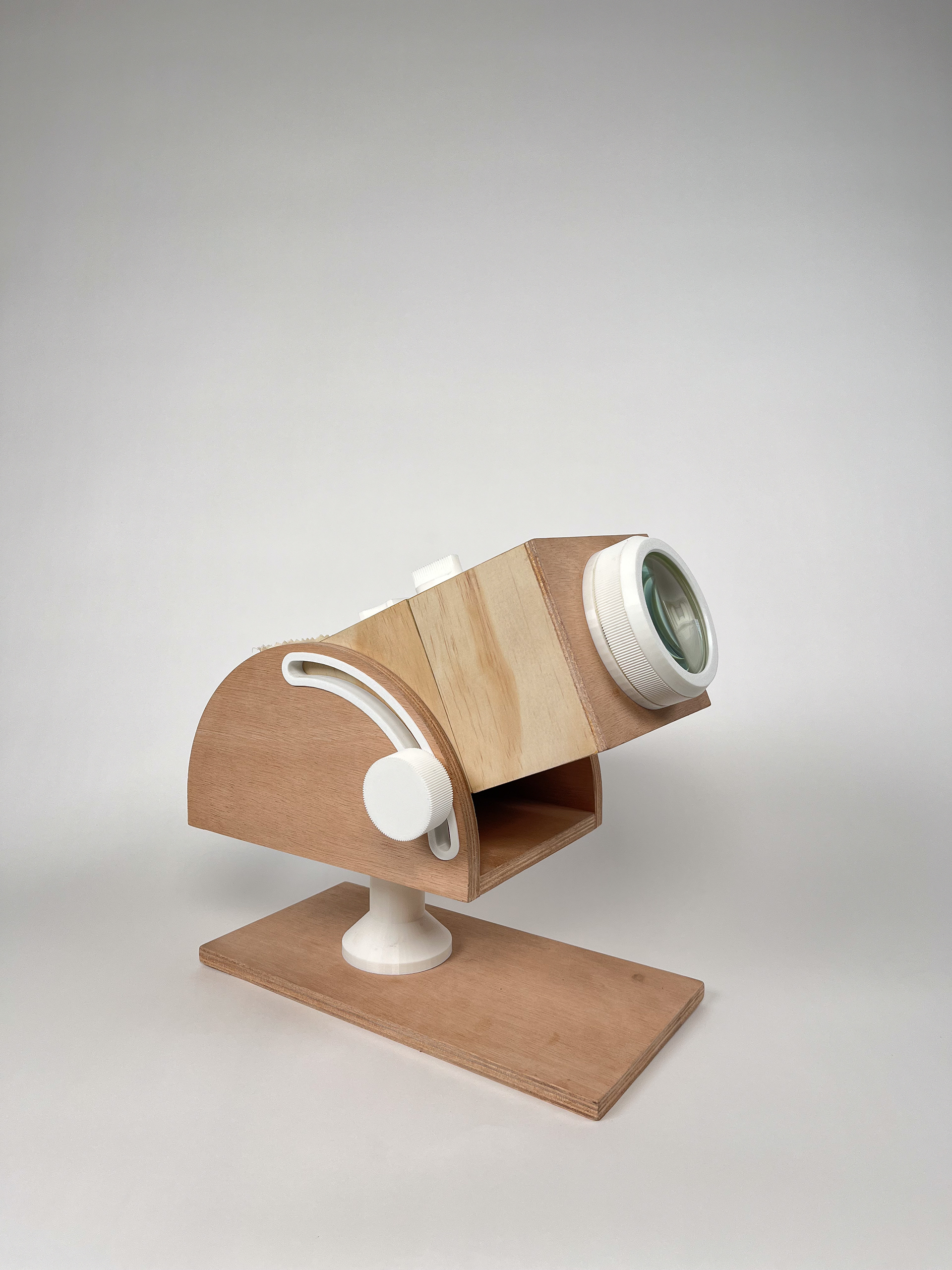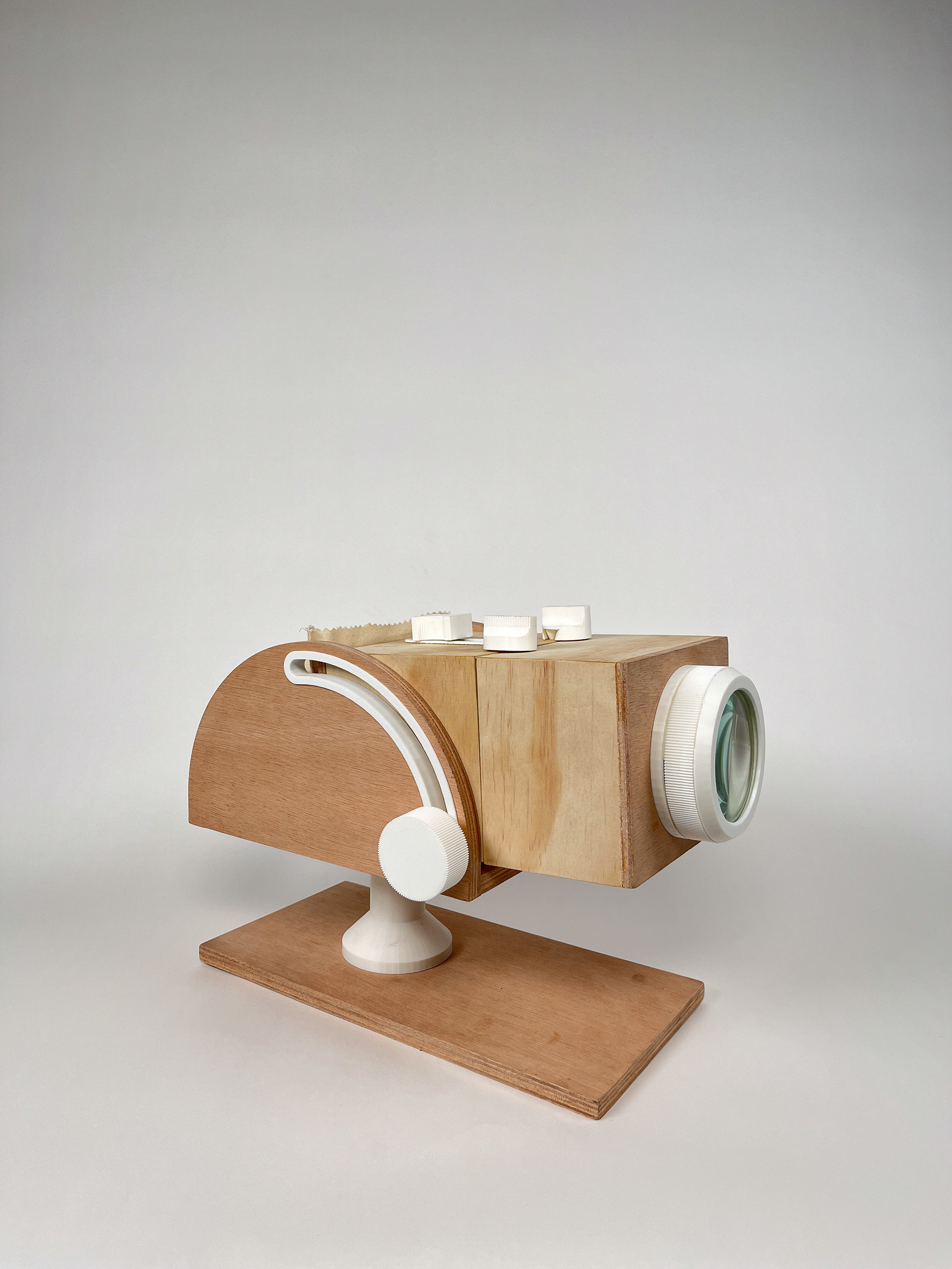 TwoFold is a cyanotype camera that opens to photogram and closes to photograph, allowing for twice the amount of exposure opportunities. To facilitate photographing, TwoFold’s angle can be adjusted by tightening and loosening the side knob and sliding to the desired position, while the telescoping lens allows for fine focus adjustments. TwoFold can easily enter its open state to photogram by unlatching its clasps and raising the photogramming base using the outside slider. The cyanotyping paper can then be fastened using magnets. The collapsing sleeve at the back provides a convenient, secure spot to store the cyanotyped images. By taking advantage of traditional cyanotype techniques and mechanical movements, Twofold exists as an entirely analog camera – paying homage to historical photograph and development methods.