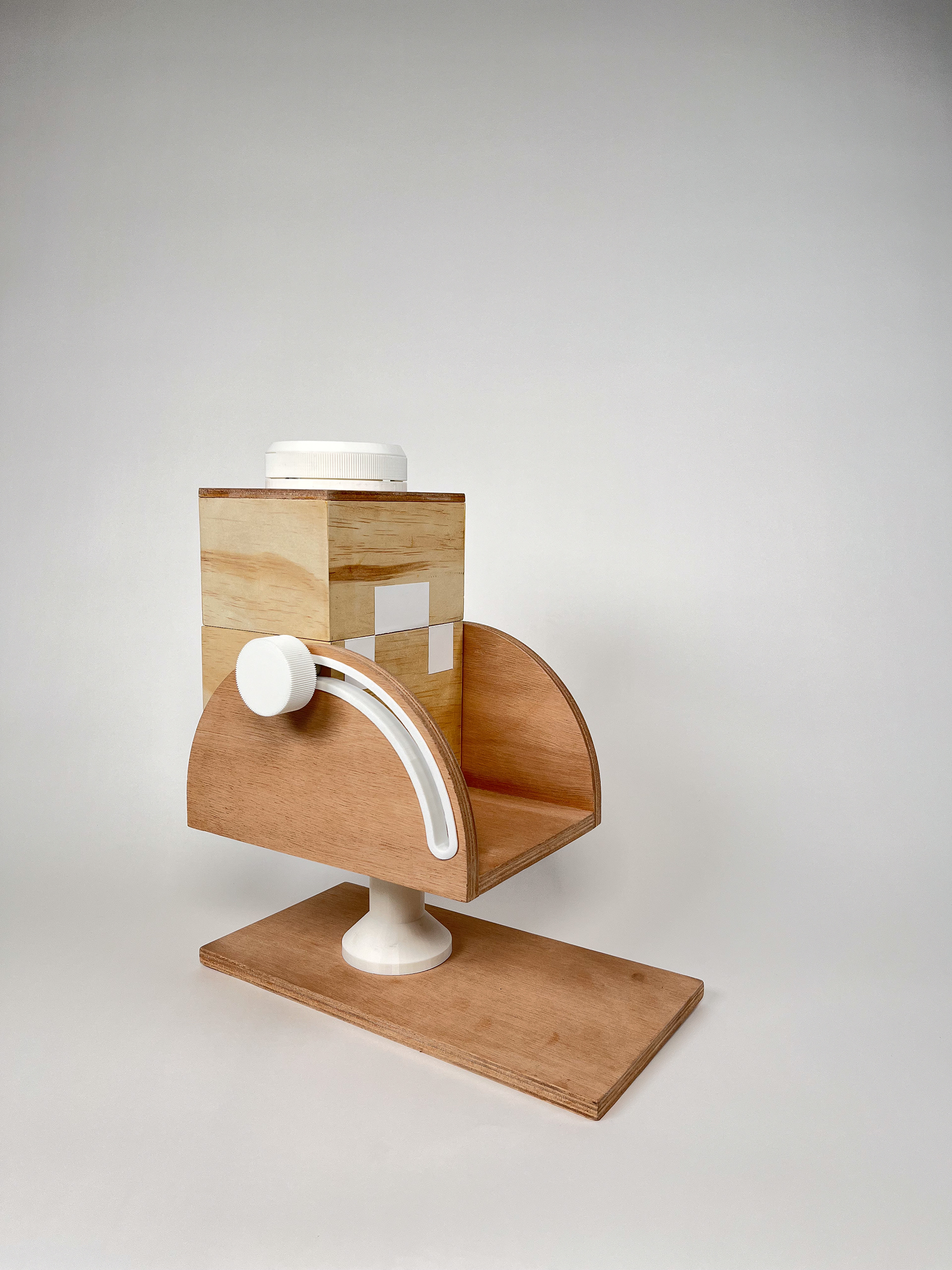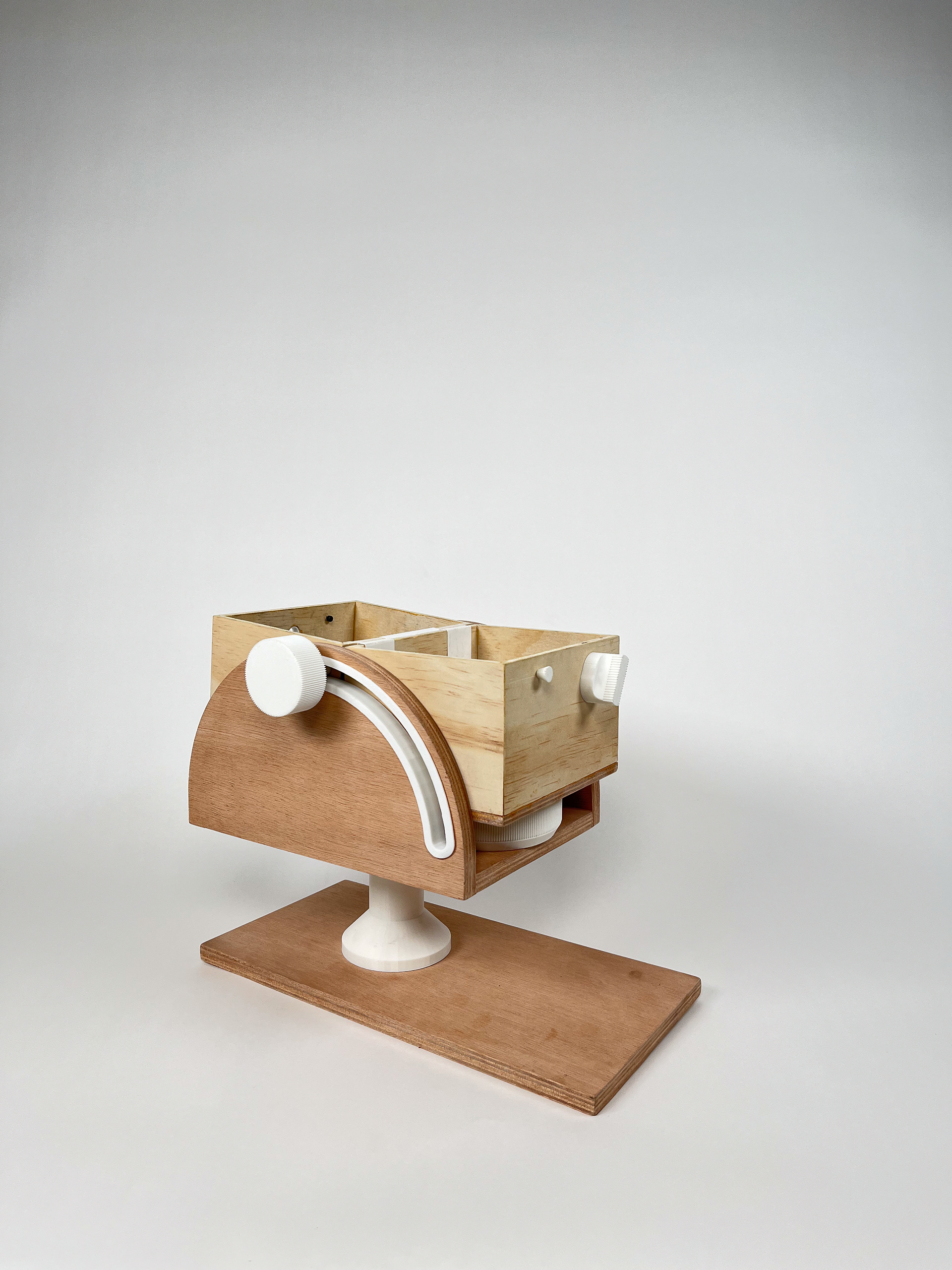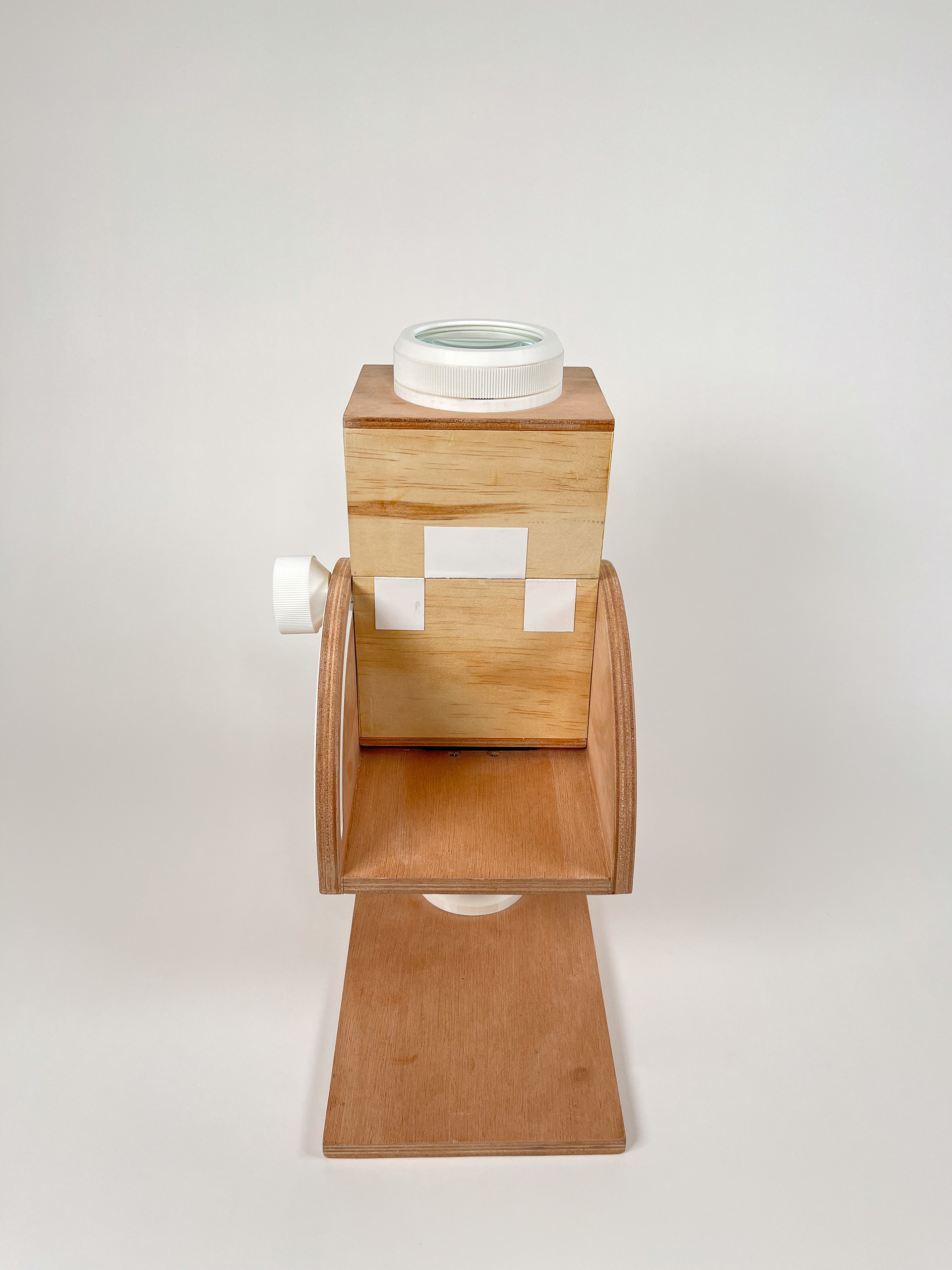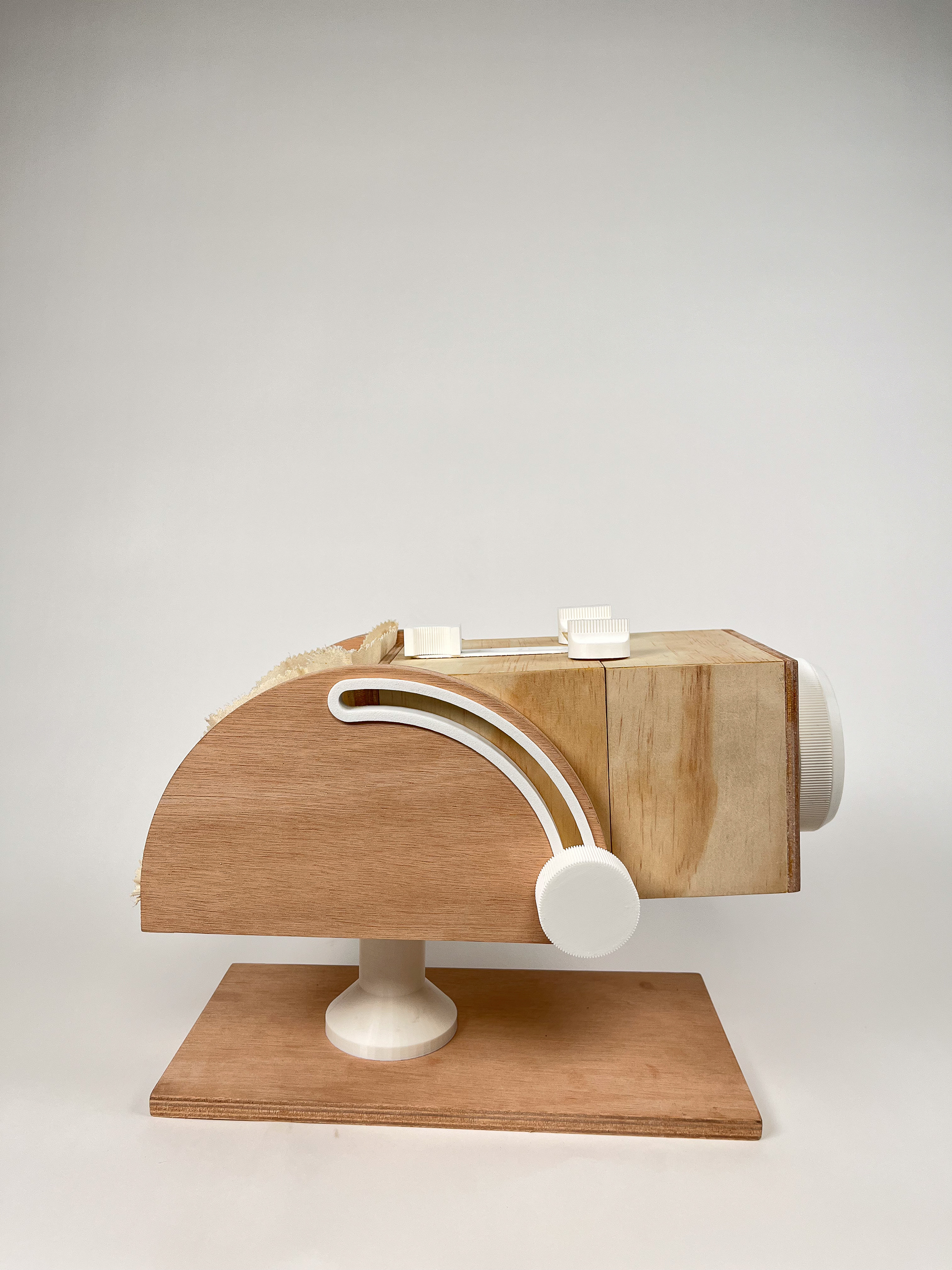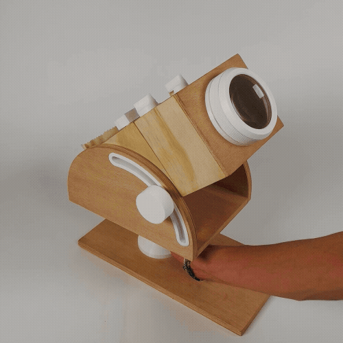 TwoFold is a cyanotype camera that opens to photogram and closes to photograph, allowing for twice the amount of exposure opportunities. To facilitate photographing, TwoFold’s angle can be adjusted by tightening and loosening the side knob and sliding to the desired position, while the telescoping lens allows for fine focus adjustments. TwoFold can easily enter its open state to photogram by unlatching its clasps and raising the photogramming base using the outside slider. The cyanotyping paper can then be fastened using magnets. The collapsing sleeve at the back provides a convenient, secure spot to store the cyanotyped images. By taking advantage of traditional cyanotype techniques and mechanical movements, Twofold exists as an entirely analog camera – paying homage to historical photograph and development methods.